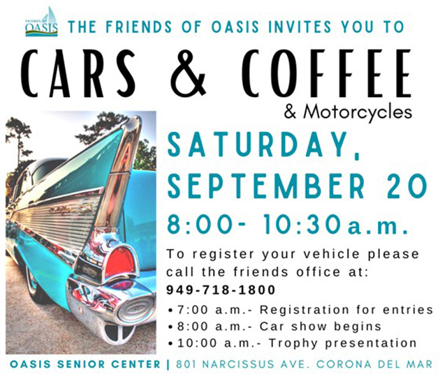 Friends of OASIS proudly presents the 7th Annual OASIS Cars & Coffee Car Show!Join us on Saturday, September 20th at 8:00 AM at the OASIS Senior Center, 801 Narcissus Ave., Corona del Mar, CA for one of the most anticipated automotive events in Newport Beach and Corona del Mar. This free community event features coffee, donuts, and an incredible lineup of 80+ prestigious and unique vehicles.This year promises to be our biggest and best yet. Both our current and past Mayors will be showcasing their personal cars in a special feature called Mayor’s Corner. Plus, world-famous “Corvette Mike” will bring a truly special livery from his Anaheim showroom.Come for the cars, stay for the surprises, including some ultra-rare and unique automobiles you won’t want to miss.Want to share your story in our