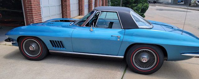 1967 Corvette Convertible, two tops, 427-390 hp, powerglide, numbers match, Three owner car with 51,000 actual miles. Marina Blue paint with Black stinger, Bright Blue interior, and White soft top. Original NO HIT body on super West Coast rust free frame with original paint, original interior, original soft top in excellent ready to show condition. This car is a magnet that will draw all the NCRS master judges to marvel over this time capsule. Original California smog car optioned with factory air, powerglide, power steering, power brakes, telescopic, speed warning, transistorized ignition, black vinyl auxiliary hardtop, posi, SS brakes, A.I.R. (Air Injector Reactor – California Smog), AM/FM radio, tinted glass, five Kelsey B.O. aluminum wheels, and red stripe radials. Most all factory correct components including the spare, jack, jack tools, clear floor mats, shocks, seat belts, washer system, smog system, shifter, shielding, braided wires, air cleaner, original drive train, original 735/736 exhaust, front LH mounted license plate support, Kelsey B.O. wheels, and T-3 headlights. Documented with the tank sticker/build sheet. The hardtop has not been off this car for at least 30 years. Unequivocally one of the nicest original Corvettes on the planet!! Looks, runs, and drives excellent. In addition, this awesome ’67 is also a Bloomington Gold Survivor and Benchmark Award winner! Documentation includes a very readable Tank Sticker! Car Collection!