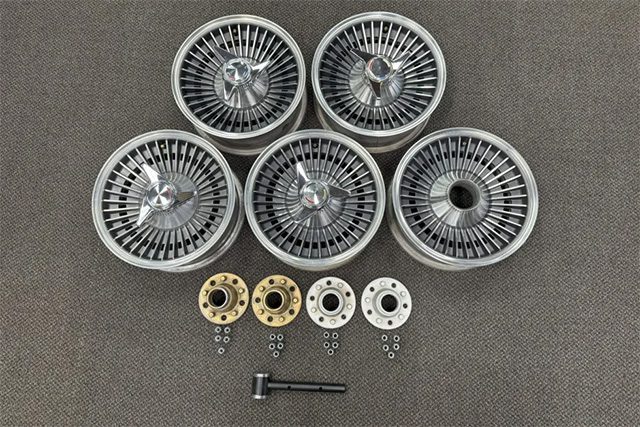 This auction is for five knock-off wheels produced by Kelsey-Hayes for use on C2 Chevrolet Corvettes. They come with center cones, a period-correct lead hammer, four hub adapters, and three-bar knock-off spinners. This set of five C2 Corvette knock-off wheels are offered at no reserve and will be sold to the highest bidder. Is this going to be you?