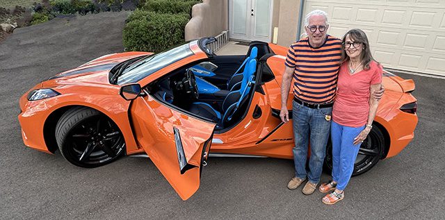 A family tradition began when I got my driver’s license at 16. I’d ask for a real Corvette, and I’d get a model or toy version . . . every birthday for nearly 2 decades! In the early 2000s, I got my SCCA racing license, and for the next 20 years all my car budget went to racing at iconic tracks around the country. Cancer and Covid put an end to my racing activities in 2020, and when I finally recovered from long Covid in 2022 I decided to transfer my racing budget to fun street cars. In early 2023, I — like most people who were looking for 2023 Z06 models — was met with long waiting lists and even steeper ADMs. It was easier and cheaper to secure an allocation for a 2023 Porsche C4S, but my desire for the Z06 hadn’t wavered and I never stopped looking. Just a couple of weeks ago, while perusing Bring a Trailer, I saw an Amplify Orange Tintcoat Z06 with blue stripes and a light blue on dark blue interior. My fiancée took one look at the color combination and said: “You have to have that car!” A special thanks to Corvette Mike for setting a reasonable reserve on this beauty, as it now resides in my garage — though you have to wear shades in there now between the orange Vette and racing-yellow C4S! Also, an even bigger thanks to Troy for arranging secured delivery and providing all relevant paperwork in the fastest time imaginable. I now have my ultimate dream machine in my garage and I couldn’t be happier!!