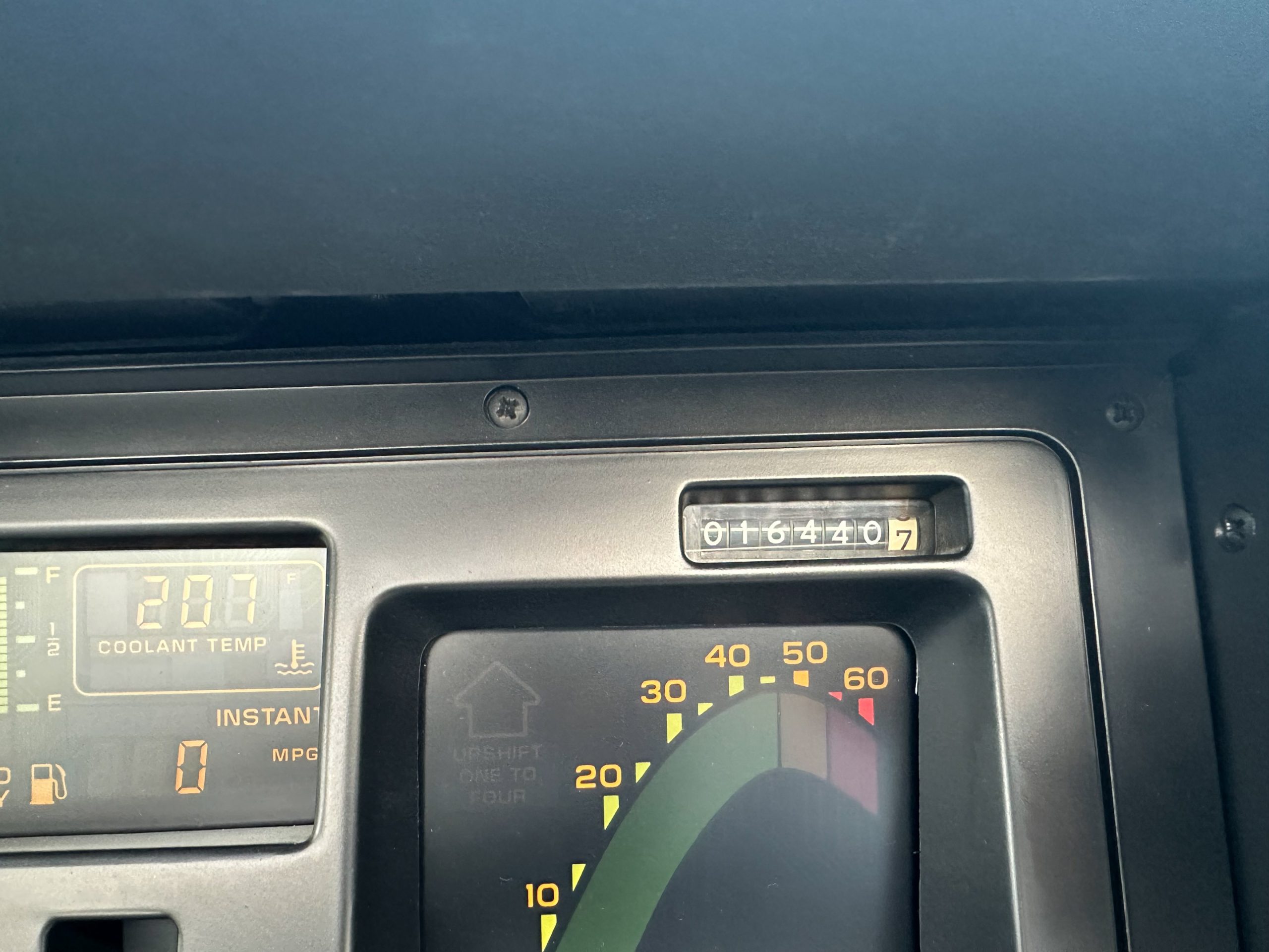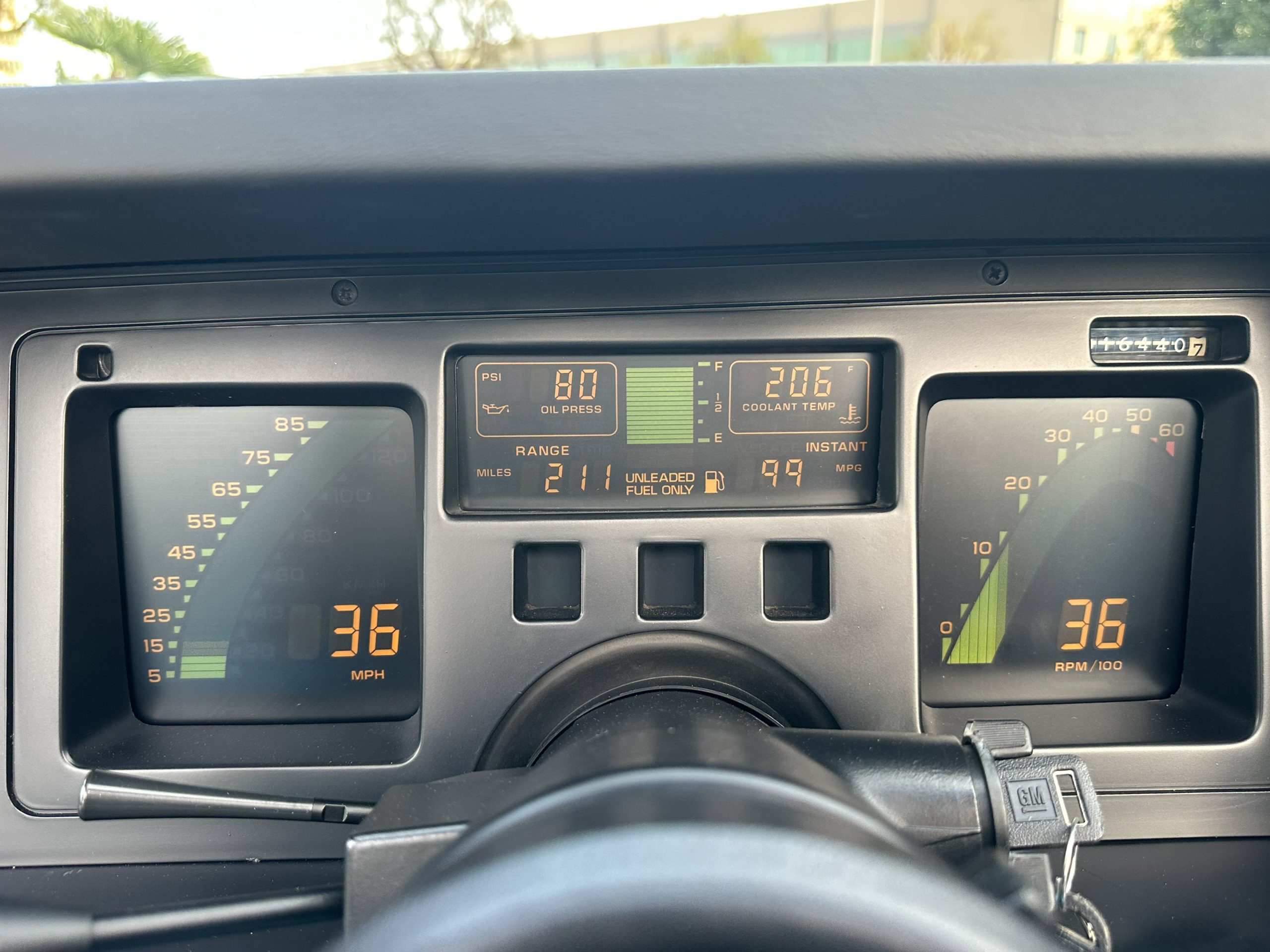 The two-spoke leather-wrapped steering wheel frames a digital instrument cluster with a speedometer, tachometer, fuel-level display, and digital readouts for oil pressure, oil temperature, coolant temperature, and fuel economy. The six-digit odometer shows 16440 miles.