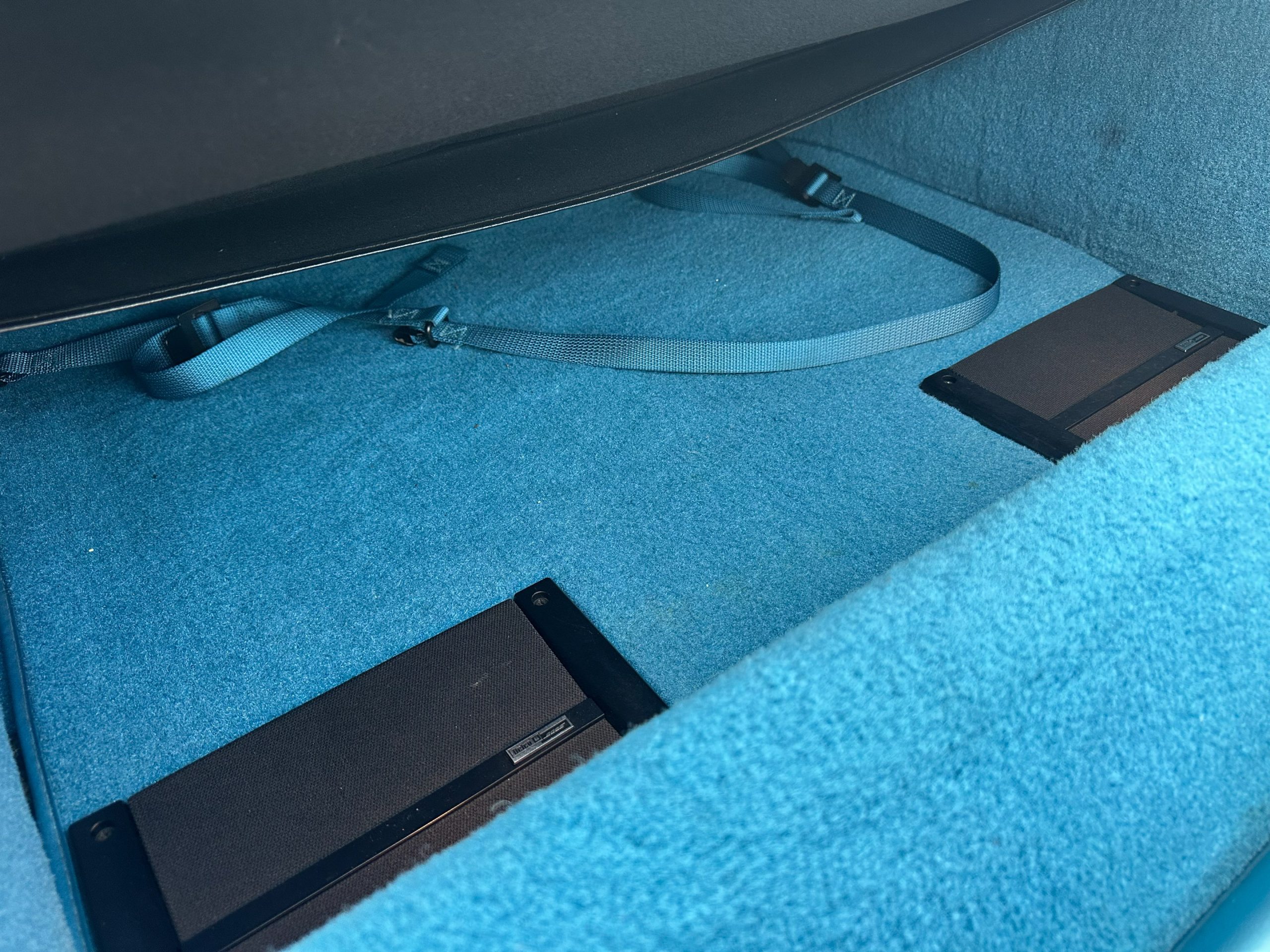 The exterior is finished in Medium Blue Metallic and features a manually operated White convertible soft top, fog lamps, sport mirrors, and quad exhaust outlets. The 17″ aluminum wheels are mounted with Kumho tires. The car is equipped with an independent front suspension and a five-link rear suspension with stabilizer bars at both ends. Braking is handled by anti-lock four-wheel disc brakes. The clear coat shows cracking near the center cap logos.